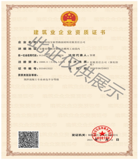 2023年8月,綜交新材料公司順利獲得建筑業企業預拌混凝土資質證書,該項資質的取得,標志著綜交新材料公司在行業內的重大突破,進一步提升了在建筑行業內的業務拓展能力和市場競爭力,更好地服務于G3銅陵長江公鐵大橋、G330一級公路改擴建工程、江北港鐵路專用線及江北新區發展等重點項目的建設,同時為綜交新材料公司在樅陽縣域混凝土市場上站穩腳跟奠定堅實基礎。