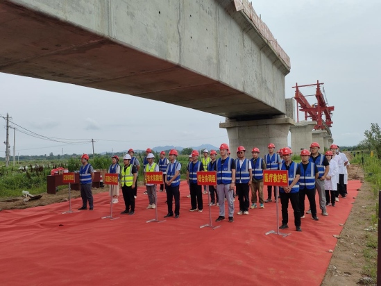 6月25日下午,江北港鐵路專用線有限責任公司聯合中鐵建長江(銅陵)港鐵建設運營有限公司,在江北港鐵路專用線項目黃泥河特大橋68#墩附近舉辦T梁架設高處墜落事故應急演練。本次演練由江北港鐵路專用線公司董事長、總經理張葉來擔任總指揮,中鐵二十局項目經理部安全總監鐘健任現場指揮,廬江縣應急管理局總工程師顧德祥、廬江縣發改委總工程師朱雷、泥河鎮人民政府黨委副書記高磊受邀蒞臨現場指導點評。江北港鐵路專用線公司安全質量部、工程管理部,上海先行項目監理部,中鐵十六局、中鐵二十局項目經理部相關人員參加活動。