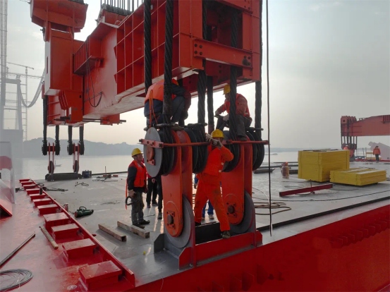 “經(jīng)過周密部署和精心準(zhǔn)備,第一節(jié)鋼梁架設(shè)比施工安排提前了3天。”中鐵大橋局G3大橋項(xiàng)目部一分部副經(jīng)理任引亮介紹,鋼梁由1600噸架梁吊機(jī)從江面駁船上吊到43米高的主塔下橫梁上,與導(dǎo)梁精準(zhǔn)拼接,隨即將已拼接鋼梁節(jié)段及架梁吊機(jī)整體向邊跨方向頂推,而后架梁吊機(jī)向主跨位置走行至架梁位置處繼續(xù)提升鋼梁,如此循環(huán)直至將邊輔跨鋼梁全部安裝完畢。