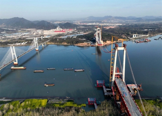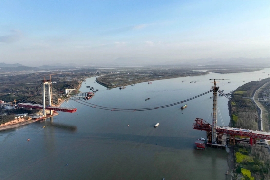 3月21日,中鐵大橋局施工機(jī)械在G3(京臺高速)銅陵長江公鐵大橋架設(shè)中跨鋼梁。