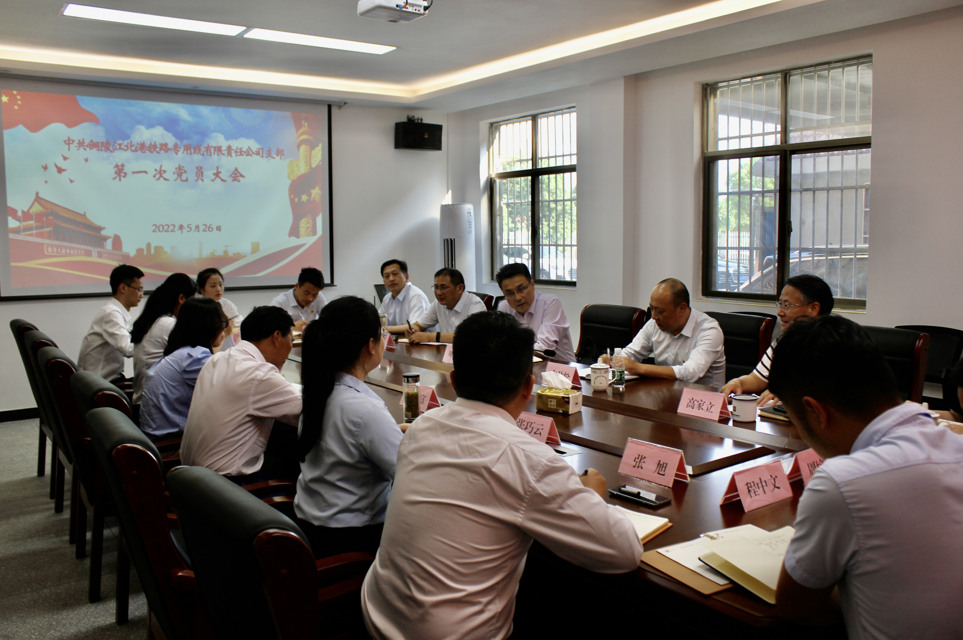 5月26日下午,江北港鐵路專用線公司黨支部第一次黨員大會在公司一樓會議室隆重召開。集團公團總經理周文勝出席會議并作重要講話,集團公司黨委副書記方勁松,集團公司總工程師,江北港鐵路公司董事長、總經理張葉來等領導同志參加會議。會議由公司副總經理高家立主持,參會黨員共12人,其中有選舉權的黨員9人。