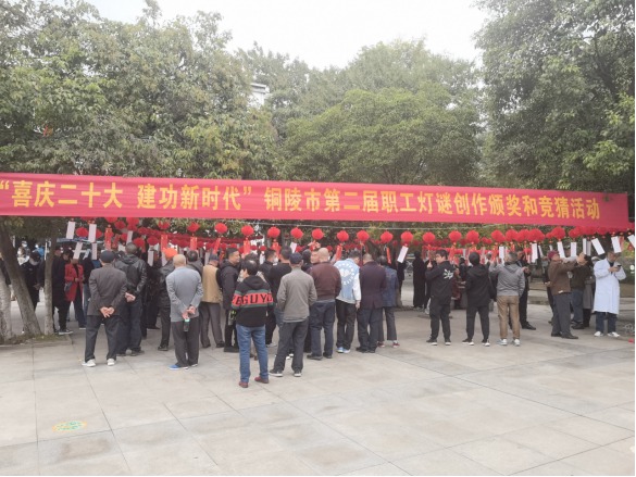 組織部分職工參加由市總工會(huì)舉辦的“喜慶二十大 建功新時(shí)代”燈謎競(jìng)猜活動(dòng)。當(dāng)天活動(dòng)現(xiàn)場(chǎng),人頭攢動(dòng),四百余條五顏六色的“燈謎”懸掛當(dāng)空,熱鬧非凡。大家被各式各樣的燈謎深深吸引,整個(gè)競(jìng)猜現(xiàn)場(chǎng)喜慶有序,不時(shí)傳來(lái)陣陣歡聲笑語(yǔ),氣氛歡樂(lè)祥和。本次猜燈謎活動(dòng)融政治性、趣味性于一體,寓教于樂(lè),既弘揚(yáng)了中華民族的傳統(tǒng)文化,又豐富了職工業(yè)余文化生活。