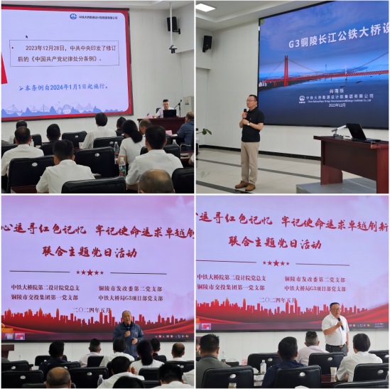 現場參觀過后,在G3大橋項目部會議室,中鐵大橋院黨建工作部部長劉建軍、中鐵大橋院總工程師、G3銅陵長江公鐵大橋總設計師肖海珠分別以《中國共產黨紀律處分條例》解讀、斜拉懸索協作體系橋設計為題作了輔導講座,并與聯合單位進行了交流探討。集團公司黨委副書記方勁松、中鐵大橋局G3項目部經理劉幸福參與交流。