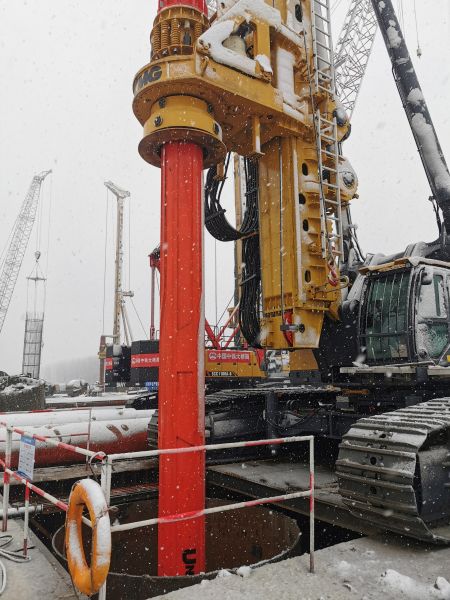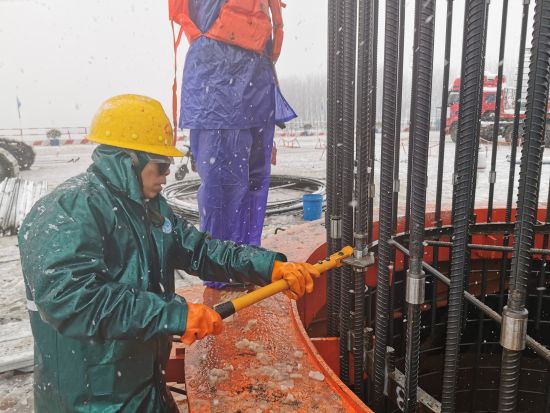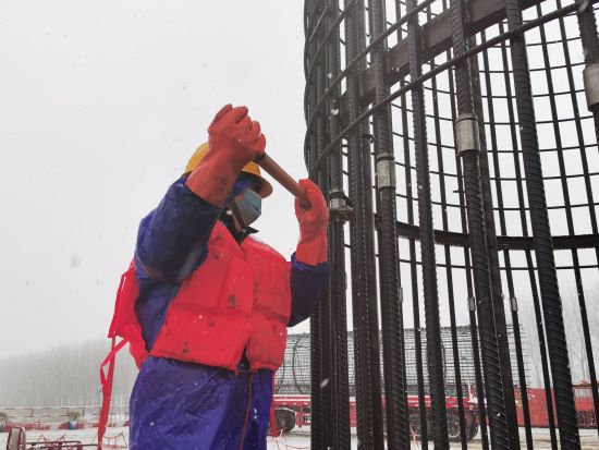 中新網安徽新聞2月7日電 (通訊員趙懿 完顏亮) 2月7日上午,連續十幾個小時大雪后,地上積雪已達到七八厘米厚,中鐵大橋局G3銅陵公鐵長江大橋現場在大雪中大干。3#主墩,5臺旋挖鉆在同時施工,工人們冒著寒冷和大雪在安裝鉆孔樁的鋼筋籠。項目部為工人配發了雨衣、保溫棉服等御寒安全用品,保障安全作業。