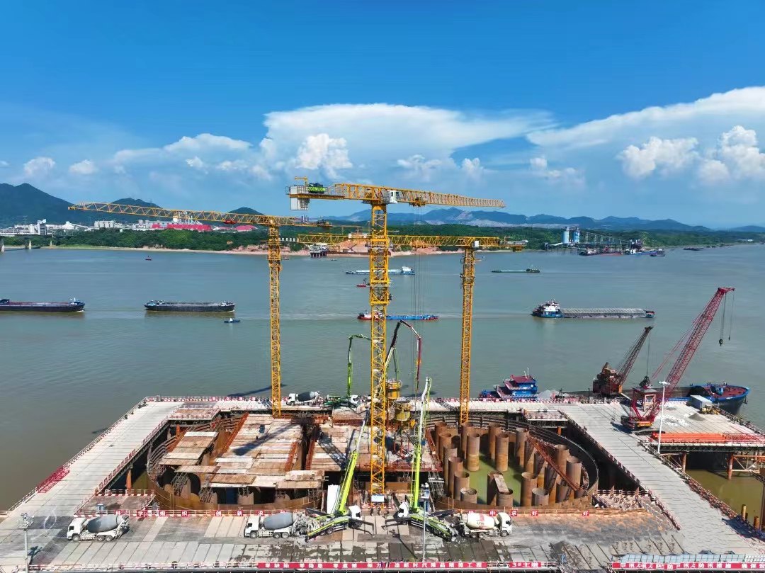 3號墩技術負責人潘萌介紹,根據3號墩圍堰結構特點、封底混凝土的數量及混凝土的生產運輸能力,整個鋼圍堰分成7個隔艙進行封底,單艙封底混凝土最大達4033.0立方米。根據施工方案要求,按照從低處到高處的原則對圍堰各個隔艙進行封底。“此次施工采用中央集料斗拔球,多導管布置、從低角落向對側逐步推進的水下混凝土封底工藝。”潘萌介紹,現場施工時,將中央集料斗臨時固定在相應位置,采用多臺汽車泵向中央集料斗集中供料,待集料斗中混凝土滿足首灌要求后,進行首灌“拔球”,其余導管采用“插管法”施工,不斷循環往復,直至封底完成。