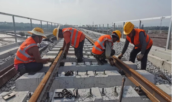 銅陵江北港鐵路專用線項(xiàng)目迎來關(guān)鍵節(jié)點(diǎn)。5月25日,在章家院特大橋施工現(xiàn)場(chǎng),隨著第一根25米長(zhǎng)鋼軌穩(wěn)穩(wěn)落入軌枕承軌槽內(nèi),標(biāo)志著銅陵江北港鐵路專用線項(xiàng)目正式進(jìn)入鋪軌施工階段。